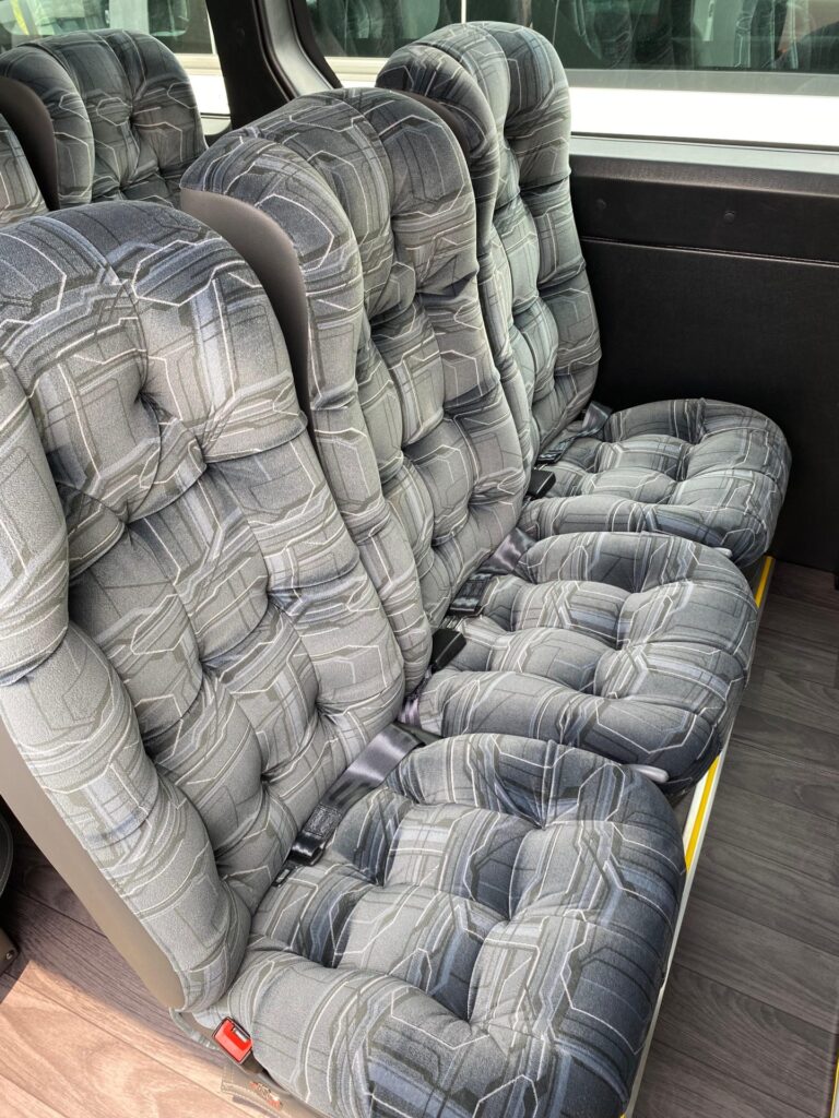 Até 46 Poltronas no estilo rodoviário, com até 4 estágios de reclinação, Com ar condicionado, sanitário, cortinas de isolamento térmico e cabine do motorista separada do salão.